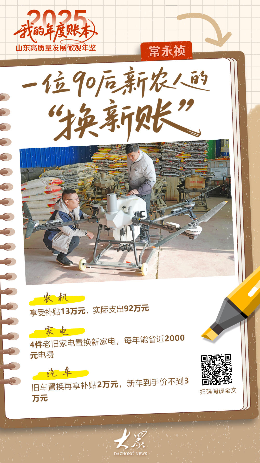 受益于国家补贴,常永珍在2025年升级了农机、更换了家电、开上了新车,一个90后新农民的“新账”。岁末年初,鲁西平原降温。聊城市茌平区杜郎口镇包庄村的田野,已经消失了农忙季节的喧嚣。 90后新农民常永珍翻开2025年账本,明显的“旧账换新账”引起了记者的注意。从升级农机到更换家具、更新交通设备,这个账号不仅记录了他生产生活的每一个变化,也体现了山东通过以旧换新政策盘活农村消费市场、赋能乡村振兴的生动本领。自2015年创办人民种植专业合作社以来,常永振凭借对农业的热爱,他的创业精神逐步将种植规模从最初的100公顷扩大到1300公顷。随着种植面积的扩大,陈旧的农业机械成为阻碍生产效率的“绊脚石”。去年秋收期间,一台旧玉米收割机连续罢工3次。不仅耽误了农耕季节,光是维护费用就花费了8000多元。正因为如此,常永振越来越意识到需要更新装备。但等算完之后,百万元的mga新设备投资又让他困惑了。正当常永珍陷入困境时,传来消息,省里正在深化农机报废更新政策。茌平还推出了“上门评估、上门办理、直补”服务。计算完补贴金额后,常永珍决定分批更新。最终他摆脱了淘汰旧玉米收获机,购买新型雷沃玉米收获机、智能犁、高效秸秆还田机、大型植保无人机15架。他领取部分农机补贴13万元,实际支出92万元。新装备让农业生产有了质的进步:15架植保无人机组成“空中植保队”,农药使用量减少30%;智慧旋耕犁犁深可达25厘米,有效防止土壤板结,帮助玉米增产8%;秸秆还田功能可以给土壤施肥,每公顷可降低化肥成本50元……更让常永振惊讶的是新设备带来的损失和燃料消耗的减少。今年秋收机产量损失控制在1%以下,节约用油15%。常永珍每年总共能挣20万元。田间设备已升级更新了,屋里的设备也更新了。趁着家居用品以旧换新的政策,他用四件旧货换了一批新货。 “就像一个新家一样,新电器非常节能,每个月可以节省很多电费。”常永珍冯秀莲的母亲笑着说道。常永珍还买了一辆新车。他卖掉了2008年购买的大众桑塔纳,更换为吉利熊猫纯电动汽车后,获得了2万元的新能源汽车购置补贴。新车售价不到3万元。 “纯电动汽车成本低,充电方便,越算越值钱。”常永珍说道。常永珍一家的“双升级”是茌平区以旧换新政策见效的缩影。 2025年,茌平区将以旧换新政策作为惠民工程、惠民工程持续加大政策支持力度,持续优化服务流程,让群众和企业真正享受到红利政策。 12月份,共发放家电补贴2275万元,收到农机购置补贴申请1613份,使用农机购置补贴资金1520万元。 (大众日报记者 薛良成 聊城日报记者 夏旭光 通讯员 刘明明 崔玉清) ■主角称,用“新帮手”取代“老伙伴”,一年可多赚20万元 □ 90年代出生的新农民常永珍,将合作社的部分“老伙伴”换成了先进的“新帮手”。如今合作社拥有30多台农机。他们在自己的农场打工后,还可以服务超过300名农民,每年还可以额外赚取20万英里!房子已经--也更新了我的电器和新能源汽车。如今,一流的节能家电每年可节省近2000元电费,纯电动汽车每年可节省6000元煤气费。来年,我计划进一步拓展社会服务领域,鼓励更多周边农民从事科学农业,让自己的农场变得更高效、更绿色,让大家过上更加富裕的生活。
