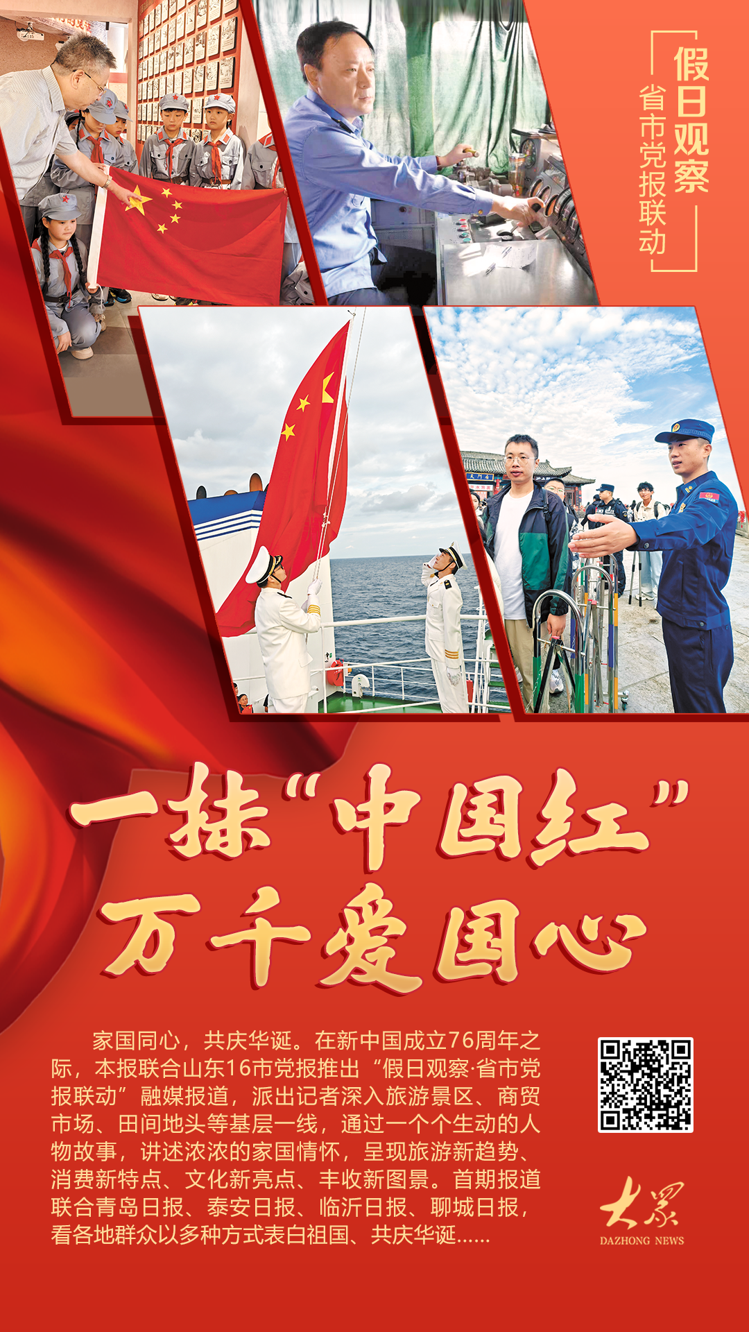 ■编辑注:整个国家和国家都团结在一起庆祝生日。在新中国成立76周年之际,我们的报纸和16个山东市政党的报纸发布了一份媒体报告,将记者送往基层的前线,例如旅游景点,商业市场和田野。通过角色生动的故事,他们讲述了强烈的家庭和乡村感情,这些感受呈现出新的旅游趋势,新的消费特征,新的文化亮点以及收获的新照片。请注意。青岛:五星级的危险信号是在科学探险船上升起的。 “我们在东方海庆祝伟大母亲的生日!” 10月1日的6:30,中国海洋大学的“东方红3”船(科学探险活动),科学和参谋队成员的所有成员都聚集在甲板上,举行旗帜升高仪式o要求该国的繁荣与繁荣,和平与繁荣。 “东方红3”分支机构秘书Wang Hui除了举行国旗举行仪式外,还介绍了他们还安排党员来审查该党的誓言,该派对将举办一场演唱歌曲的比赛,以庆祝国庆日。由于“东方红3”船于7月中旬从青岛航行,王海和他的同事们航行了大约80天,覆盖了黄海,东中国海和南中国海,其旅程超过9,700海里。 Wang Hui,现年56岁,在Manof这是37年,它一直在追求深海,并前往世界各地的许多海洋地区。尽管他在旅途中发现了暴风雨和大量浪潮,并经历了欺负,呕吐和失眠,但王公仍然说:“我喜欢我的职业,其中包含中国人民追求星星和海洋梦的野心。” Wang Hui SA一旦海上进行了科学探险,我的耳朵突然响起了一个清晰的声音:“这是中华人民共和国的海军。那一刻,船上的一切都充满了幸福和安全。 “我们不在海洋深处团结。我们被海军包围,在我们身后是我们坚强的祖国。一种自豪感是自然的,我们的工作更加充满活力。”泰恩:连续11个全国日停留11个。 10月1日上午5:30,黎明。 Taishan消防局的18名消防员聚集在Taiping,Taiping,风景秀丽的地区。在再过55分钟内,举办了一场盛大的仪式。我们在这里凌晨4点站在这里,凌晨4:20来到这里,这是一种致敬,并反复举起消防救援站的举报仪式,消防员迅速聚集在一起,跑回救援站,来自世界各地的游客泰德太极山。为了确保游客的安全,他们短暂休息了,然后将自己分配给了极端的值班工作。今年张康(Zhang Kang)在陶珊(Taishan)工作了11年。在11个全国假期中,他从未离开过一天。目前,他负责山顶的职责,肩膀的责任更大。在7:35,张到达了Nantianmen的观看平台。目前,这是游客下山的高潮。他打开声音,提醒游客注意安全,并指导人们以适当的方式向前迈进。在此期间,他不得不回答游客的各种问题:“这是榕树?”那是在哪里? “到达山顶需要多长时间?” “……一年中的这个时候,他停止了六到七个小时。有时候有很多游客,为时已晚。Sts,他没有抱怨。 Linei:“告诉我在旧的蝗虫中的美好生活。” Xishanqian红色文化中心,Caozhuang Town,Linshu County,Zhang Qinginggui是反日本战争烈士的后裔,为林舍(Shandong)林舍(Linshu)的Zhu村红色陆军小学生提供了红色的教育课。农民导致安排“大剑协会”进行反伴侣自卫。反贾潘警告爆发后,Aktibong lumahok siya sa anti-sa ant-sa na pakikibaka na pinamunuan ng Isang libong partido。 Ay Nanguna SA MGA反日自卫队在Ang Mga Tagabaryo Na Gumamit Ng Mga Baril Ng Ibon,Lokal Na Kanyon,Malakic Espada,Sibat在MGA Tool Sa Farm的SIBAT,以击退93rd Morical Parade的仪式。 “张庆古说:“不仅chiLDREN记得历史,但烈士还告诉我们,我们没有忘记他们。 “。这蝗虫的旧树是战斗的“外观”。“曾经在村庄中间长大的蝗虫的老树。战斗发生时,旧的蝗虫被许多子弹击中,最终被战争烧毁。叶子在2002年秋天掉落后,它不再出现。现在,它变成了一个无法讲展览的“演讲者”。“清楚”,今天是一个国庆日,我们的美好生活也适合年龄较大的树。“ lioocheng:驾驶“钢骆驼机队”出国去。10月1日上午,linki International Land port in Linqing的Luxi International Land Port linqing忙碌的集装箱忙碌的集装箱是各个地方的集装箱。在货运火车的拖车板上牢固。,然后向西行驶。它在106,000 Teus的一天中仅打开了两个或三个Teus。作为普通火车司机,我手里拿着舵,还可以为皮带和道路倡议的联合建设做出贡献。 “洪海胡伊说。